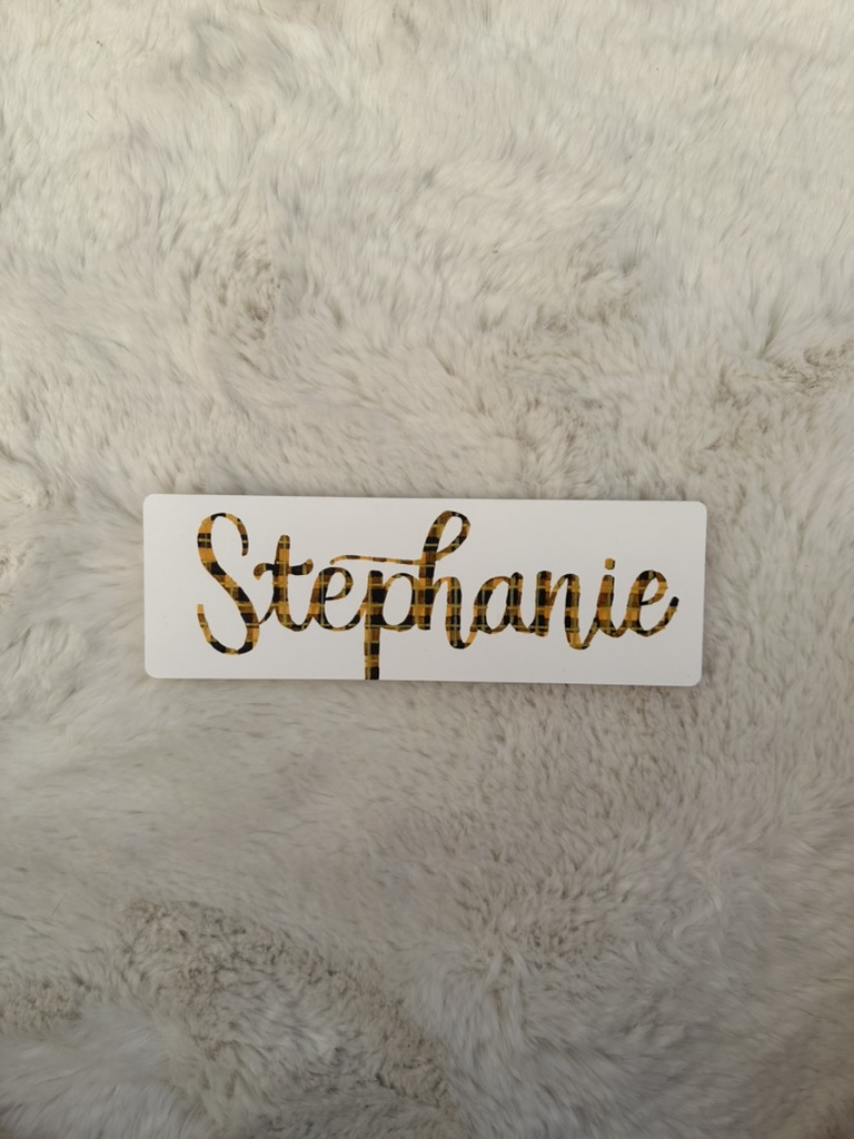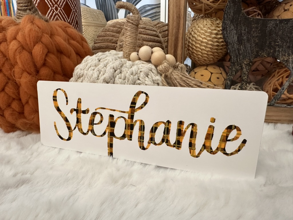 Le prénom est entièrement dessiné à la main puis rempli d’un motif écossais aux tons chaleureux — orange citrouille, brun profond, nuances caramel et fines lignes dorées contrastées — rappelant les tissus flanelle ou tartan traditionnels. Chaque trait est réalisé lettre après lettre, donnant au motif un aspect presque tissé, tandis que les nuances travaillées au feutre évoquent la douceur des couleurs d’automne et les ambiances cosy à la maison.